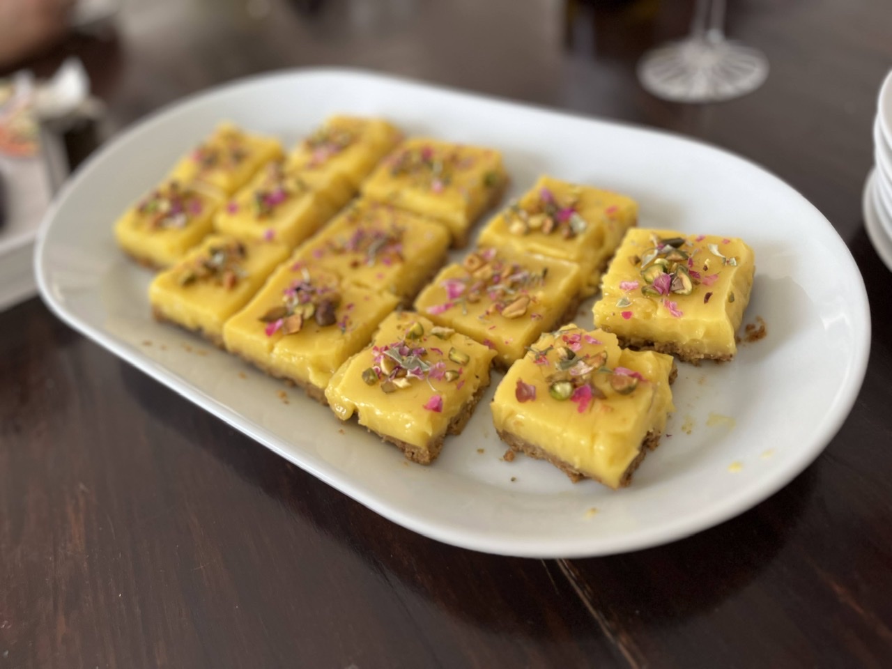 I made Pistachio-Crusted Lemon Bars. An extremely fussy recipe that resulted in tasty but not-worth-the-effort lemon bars in my opinion. I make much simpler lemon bars that are comparable in flavor. I will borrow the ground pistachios for crust, though stick with butter instead of the coconut oil, which left an overwhelming coconut flavor on the tongue. Also the rose petal garnish is gorgeous.
