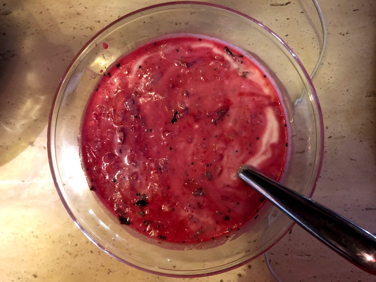 Brad also made Rainbow Root Raita. He said the recipe called for a surprising amount of water, which resulted in the whole thing becoming a pink soup as soon as he added the carrots and beets to the yogurt mixture. It was pretty runny, and Brad thinks it would have worked just fine without adding any water.