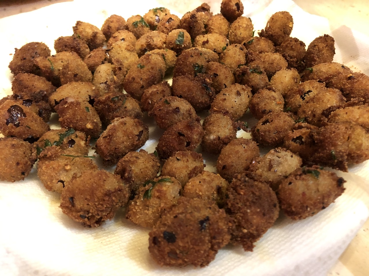 I made Chipotle-Garam Masala Olives. They’re meant to be served hot, so of course I had to try one right out of the fryer – YUM! Even having cooled down during transit to the party the olives were pretty great. Many people hovered around the table popping more olives into their mouths. The dish even got the thumbs up from several people who said they usually don’t like olives.