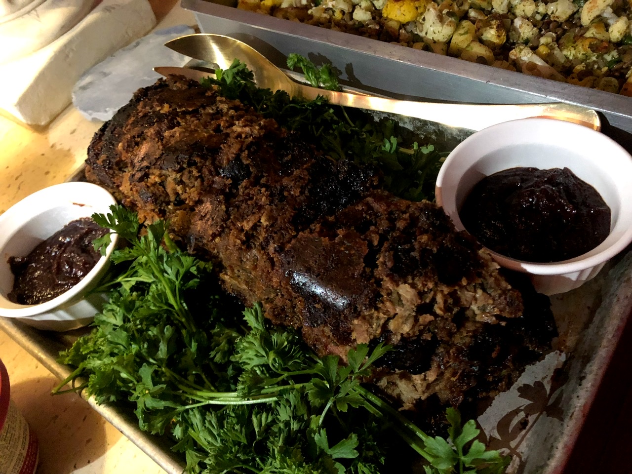 Chris made Spiced Meat Loaf. Another wonderful dish. The meat was flavorful, and oh man that glaze! The meat loaf ended up being upside down on the platter because Chris had a bit of a hard time getting it out of the pan, so he put some additional glaze on the side, which I did not hesitate to spoon on.