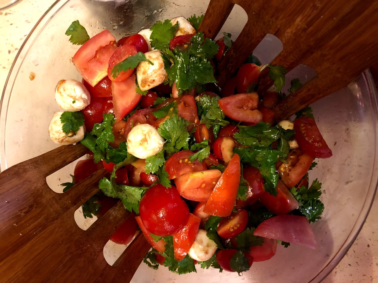 Brad made Caprese Salad with Sweet Tamarind Dressing. The dressing is for sure what makes this dish special. As I’ve mentioned, I really enjoy the sweet/sour notes of tamarind, and here they added a beautiful spin to the tomato and mozzarella of the typical caprese salad.