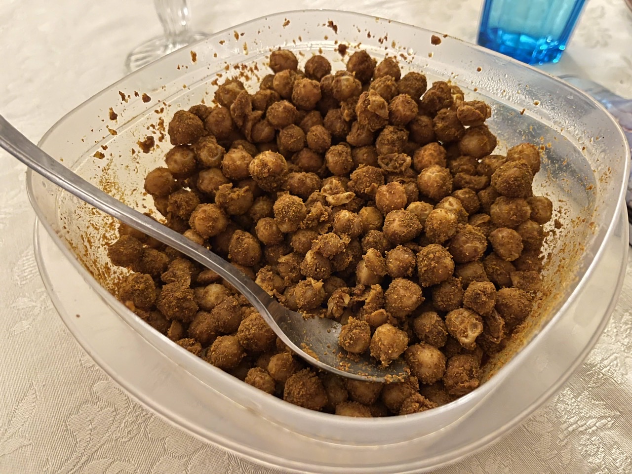 Katherine also made Spicy Curry Puffed Chickpeas. As these were deep-fried, I expected them to be crisper. I thought perhaps they had softened in transport, but Katherine said even hot out of the oil they were a bit soggy. Taste definitely won over texture in this recipe – the seasoning mixture of paprika, coriander, cumin, ginger, turmeric, cinnamon, cardamom, cayenne, sugar, garlic, and onion was a fantastic flavor explosion.