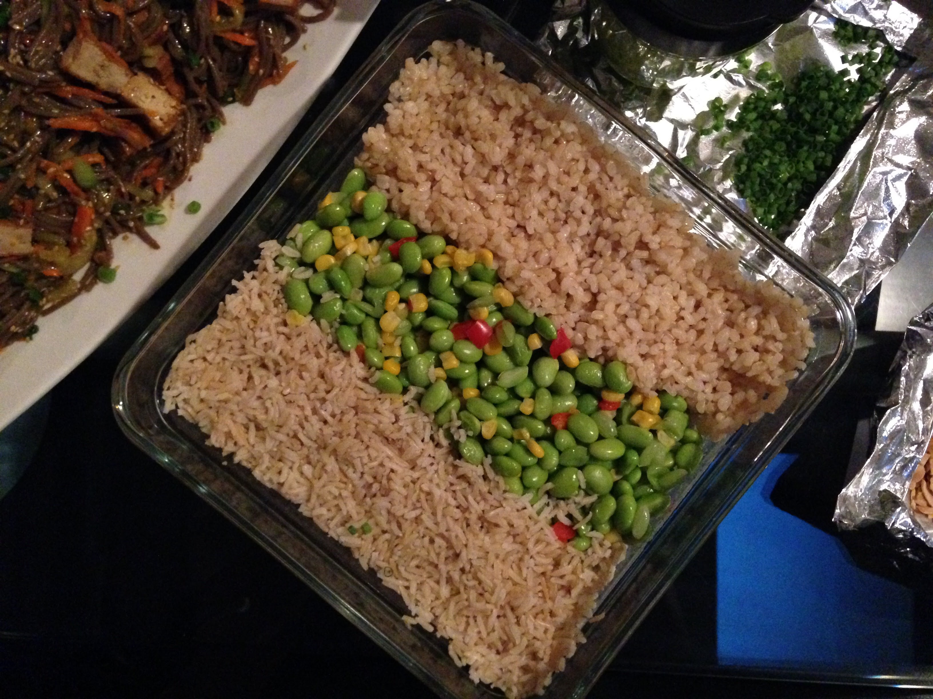 Brian made the Brown Rice Bowl with Edamame and Tamari Scallion Sauce. He thought the sauce would have been better with some ginger – I concur. Also the recipe doesn’t seem to make nearly enough sauce. By the end of the night, all the sauce was gone but more than half the rice/edamame was still left.